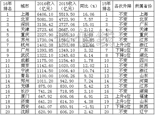 在《价值线》研究院独家梳理统计的“2016年中国城市公共财力30强排行榜”中,位居前十名的城市为:上海、北京、深圳、天津、重庆、苏州、杭州、广州、武汉、成都。 其中,四个直辖市全部上榜,苏州作为地级市的“头牌”继续稳坐全国第六。与上一年相比,前十名中最大的变化是广州的名次上升了1位,武汉下降了1位。