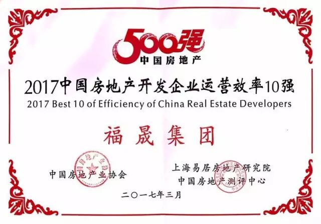 2017年3月22日,由中国房地产业协会、中国房地产测评中心联合主办的“2017中国房地产500强测评成果发布会暨500强峰会”在北京隆重召开。现场测评成果发布,福晟集团凭借稳健攀升的规模优势、品牌实力和高效的经营管理能力荣膺2017中国房地产开发企业100强第57位!蝉联2017中国房地产开发企业运营效率10强第4名!