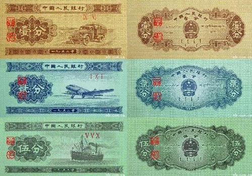 第二套人民币1953年印制完成,被称为“五三版”人民币,于1955年3月1日开始发行。共有1分、2分、5分、1角、2角、5角、1元、2元、3元、5元、10元11个面额,其中1元券有2种,5元券有2种,1分、2分和5分券别有纸币、硬币2种。为便于流通,自1957年12月1日起发行1分、2分、5分三种硬币,与纸分币等值流通。1961年3月25日和1962年4月20日分别发行了黑色1元券和棕色5元券,分别对票面图案、花纹进行了调整和更换。