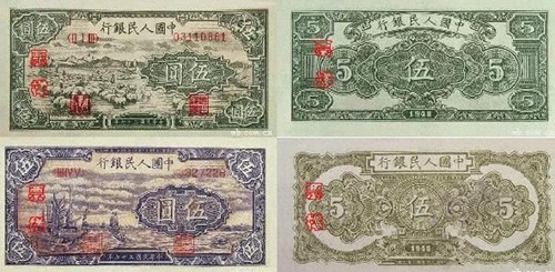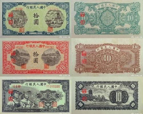 第一套人民币1948年12月1日发行,到1955年5月10日停止流通。该套人民币共12种面额,62种版别,总面值17.655万元。其中1元券2种、5元券4种、10元券4种、20元券7种、50元券7种、100元券10种、200元券5种、500元券6种、1000元券6种、5000元券5种、10000元券4种、50000元券2种。