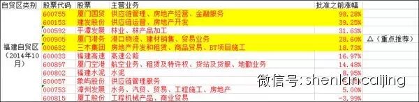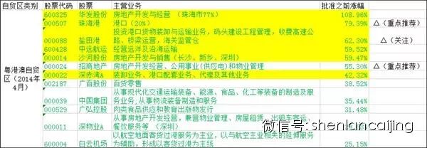 从上图可以看出,若上述自贸区被批准之后,应该重点关注的股票是主营业务为房地产开发和经营、港口运输和服务以及仓储物流。基于这样的逻辑,三个自贸区中目前涨幅比较少,而主营业务又是上述三者之一的股票主要有中储股份、厦门港务、盐田港、中远航运以及深赤湾A。而上面三个自贸区中底色为黄色的都是自贸区批准之后需要重点关注的股票。