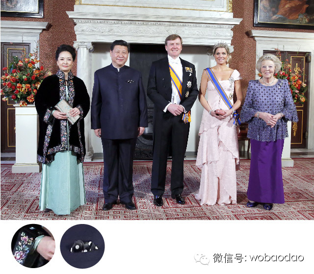 3月22日,习大大在阿姆斯特丹会见荷兰国王威廉-亚历山大。彭麻麻身着黑底牡丹花刺绣饰边对襟大褂和粉青色长裙,面料飘逸,与习大大的改良式中山装,主体色调一致。同时,大大衣兜里的小丝巾也与彭麻麻的饰边相称。