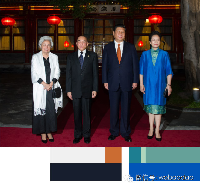 9月25日晚,在北京钓鱼台国宾馆会见柬埔寨国王西哈莫尼和太后莫尼列。妃色领带与宝蓝色大褂以及石青旗袍的互补色搭配。