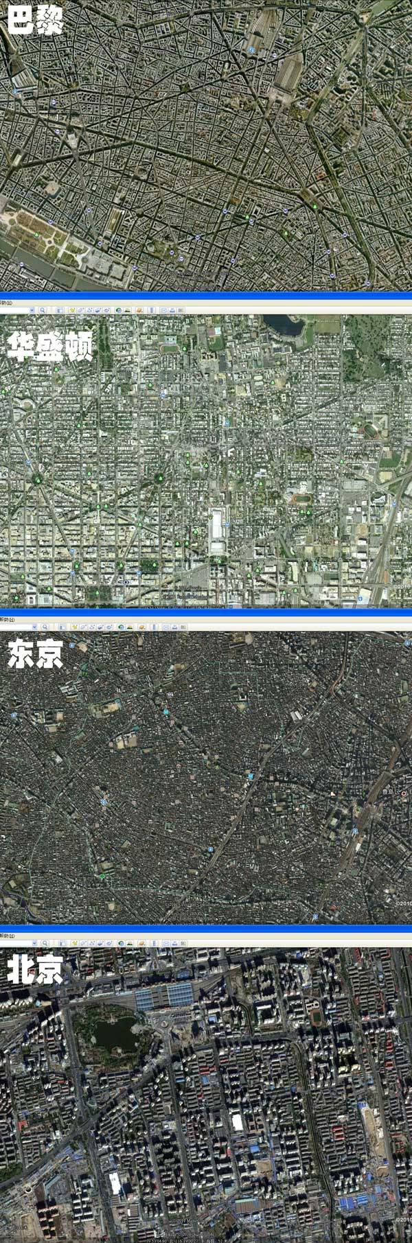 从图上可以看出,巴黎与华盛顿的街道纵横交错几乎无法统计,而东京虽然从表面上看来密密麻麻的都是房子,但其间的细小道路却布满了整个画面以至于很难分辨。