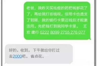 姜丽是个大二的学生,同样的也参与过这类关注群发领奖励的活动。在参与后的半个月,姜丽的爸爸收到了“姜丽”发来的短信,短信内容是这样的: