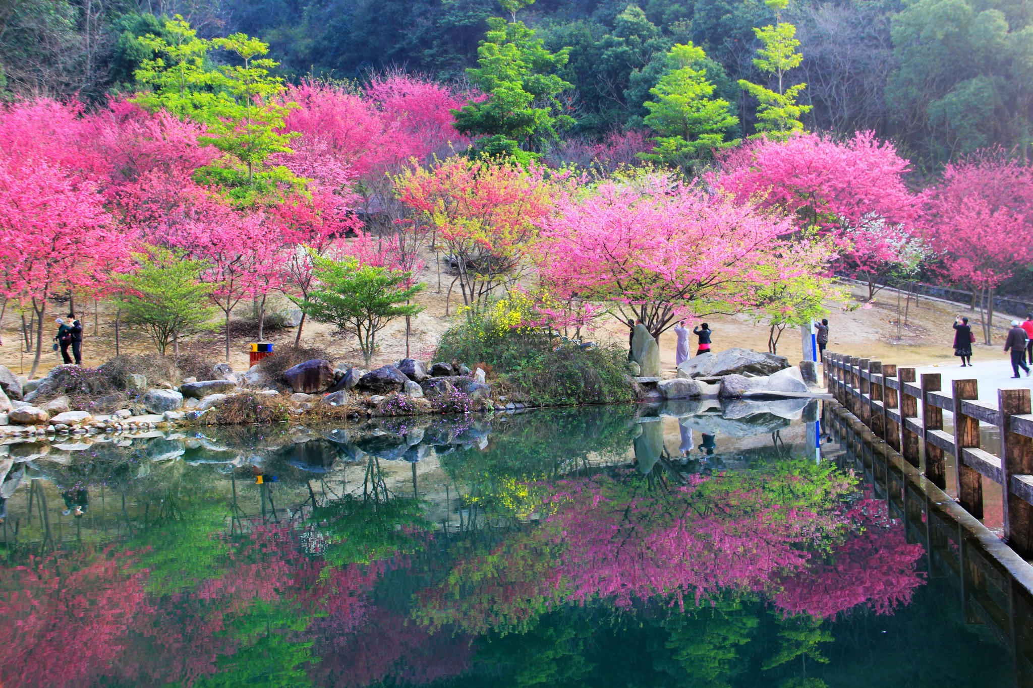 早春时节,来到福州森林公园,樱花正开得烂漫。粉色的樱花倒映在平静的水面,在湖光山色之间,如同幻境一般。