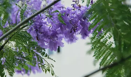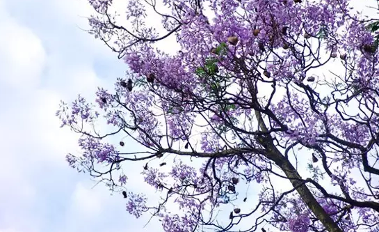 离仓山师大附中不远的对湖路,和仓山区的复园路,每到5月份,便会开出淡紫色的蓝花楹。这种小花在细细的枝干上,仿佛紫色的云彩。轻风吹过,花瓣如雨般飘落,散落在道路两旁,在晚春时节,也是一番美景。