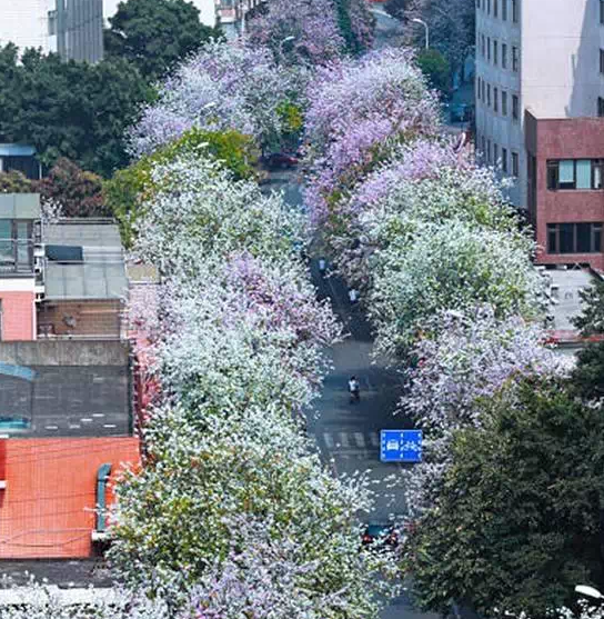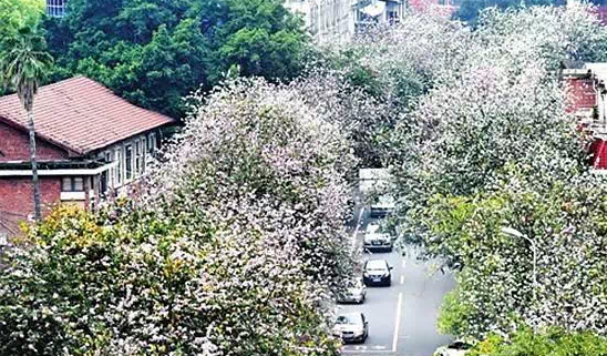 在福州,许多地方都有羊蹄甲,工业路、朝阳路、温泉支路两旁都盛开此花,其中工业路的羊蹄甲最是有名。行走在街道上,插上耳机,听一曲保罗·西蒙的《April Come She Will》,看古寺古塔从羊蹄甲的花枝间冒出,实在是在这个城市里最诗意的事情。如歌中所唱,羊蹄甲就像歌中女子一般,四月,她会来。