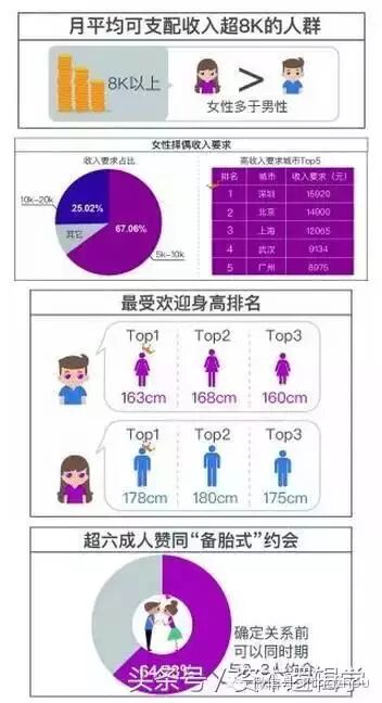昨天,在某网站发布了一份4500人的调查报告:《2016年单身人群现状系列报告第三期》。报告中显示,“黄金单身族”指的是月平均可支配收入超8000元的单身男女!另外,报告还显示,在身高方面,男的178cm、女的163cm最受欢迎;家庭条件:42.78%的单身姑娘认为门当户对很重要,而90.17%的单身小伙则认为感情更重要,好家境非必要条件。